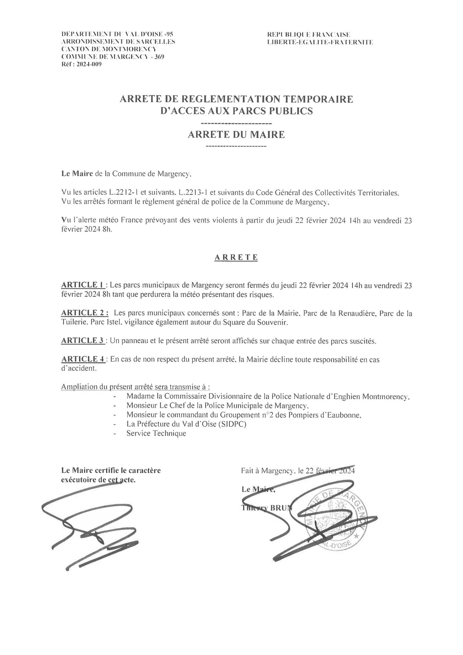 VIGILANCE ORANGE VENTS VIOLENTS Le département du Val-d'Oise est en vigilance orange pour le phénomène vents violents. A cette occasion, les parcs municipaux de Margency seront fermés ce jour à partir de 14 h. Pour votre sécurité, soyez prudents. |