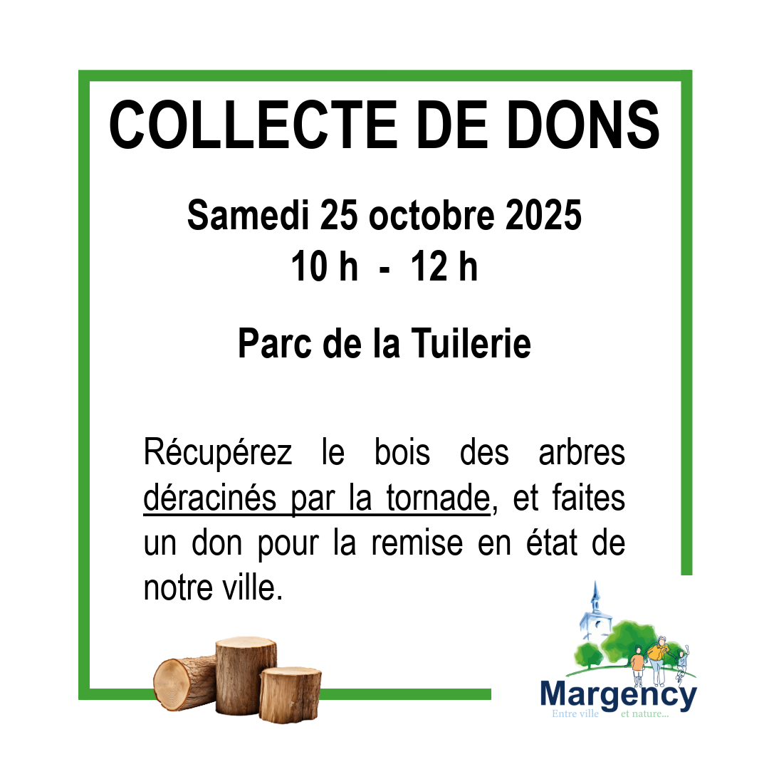 Les habitants de Margency, des communes voisines et du Val d'Oise qui le souhaitent pourront venir récupérer du bois ce samedi 25 octobre de 10h à 12h au parc de la Tuilerie, en échange d’un don à la mairie (par chèque à l’ordre de MARGENCY SOLIDAIRE). Même sans récupérer de bois, il est bien sûr possible de participer à cette collecte solidaire en faisant un don à la mairie. |