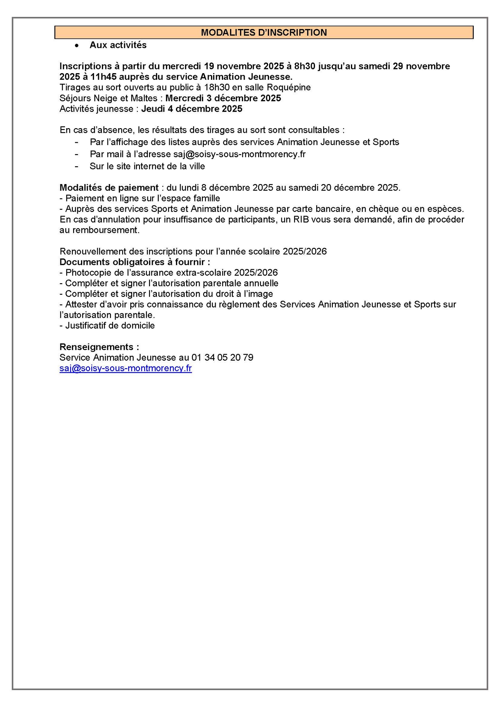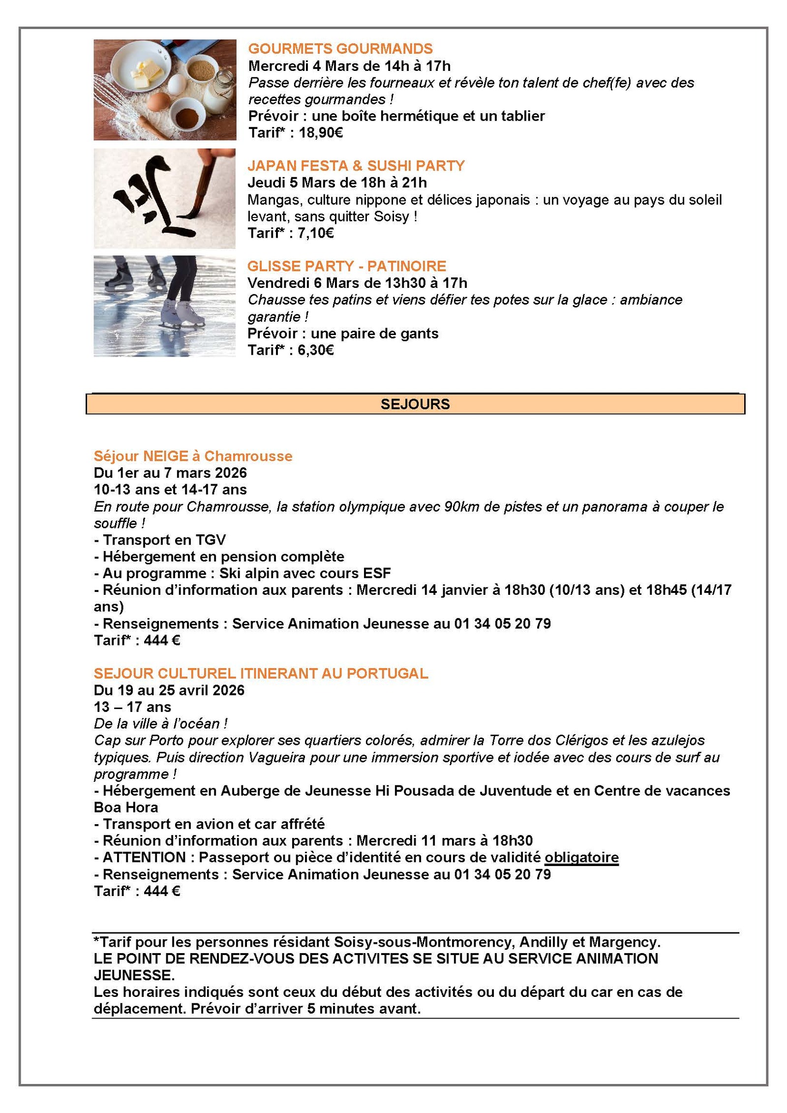 Programme vacances d'hiver Cette année encore, le programme des vacances d'hiver pour les habitants de Soisy, Andilly et Margency est riche et varié en ateliers et animations. Alors n'attendez plus ! Réservez les vacances de vos enfants au service Animation Jeunesse de Soisy par téléphone au 01 34 05 20 79 ou par mail à saj@soisy-sous-montmorency.fr |