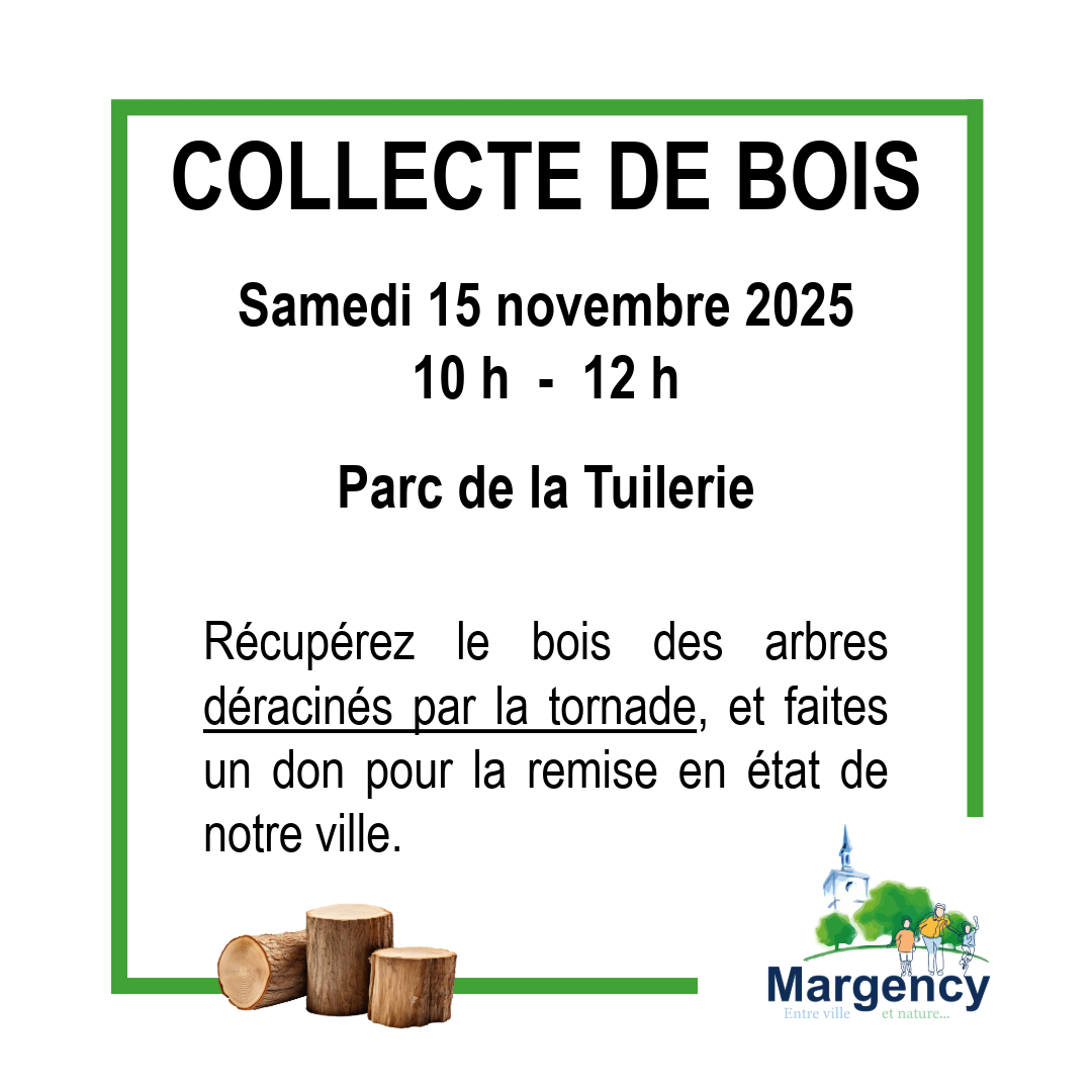 Les habitants de Margency, des communes voisines et du Val d'Oise qui le souhaitent pourront venir récupérer du bois ce samedi 15 novembre de 10h à 12h au parc de la Tuilerie, en échange d’un don à la mairie (par chèque à l’ordre de MARGENCY SOLIDAIRE).