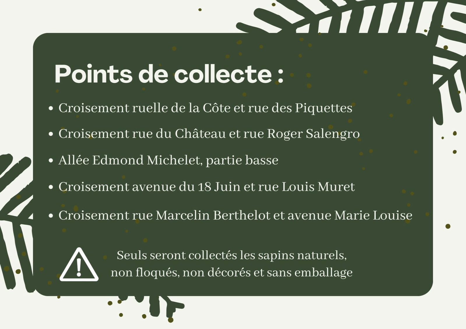 SAMEDI 10 JANVIER 2026 Donnez une seconde vie à votre sapin. Une fois Noël passé, vos sapins peuvent être triés, recyclés et transformés. Broyés, ils peuvent être réutilisés, pensez-y car collectés avec les ordures ménagères, les sapins terminent incinérés, sans autre forme de valorisation. Si vous souhaitez obtenir du broyat suite au ramassage, vous pouvez nous le signaler par mail à info@mairie-margency.fr Toutes les rues de Margency seront collectées le samedi 10 janvier à partir de 8h30 et vous pourrez mettre votre sapin dans le point de collecte le plus proche de chez vous dès le 25 décembre. Certaines rues difficiles d’accès nécessitent des points de collecte. Cinq points de collecte sont prévus : 1. Au croisement de la ruelle de la Côte et la Rue des Piquettes pour les rues suivantes : - Ruelle de la Côte - Sente des Sablons - Rue Henri Brochard - Rue du Docteur Schweitzer - Rue du Château 2. Allée Edmond Michelet, partie basse pour l’ensemble de l’Allée Edmond Michelet 3. Rue du Château, pour Sente des Sablons et alouteurs du cimetière 4. Au croisement de la Rue Marcelin Berthelot et de l'Avenue Marie Louise 5. Au croisement de l'Avenue du 18 Juin et de la Rue Louis Muret, pour les rues : - Auguste Renoir - E.Degas - E.Manet - J.B Corot - A.Sisley IMPORTANT Seuls seront ramassés les sapins naturels, non floqués, non décorés et sans emballage. Pensez à sortir vos sapins avant 8h ! |