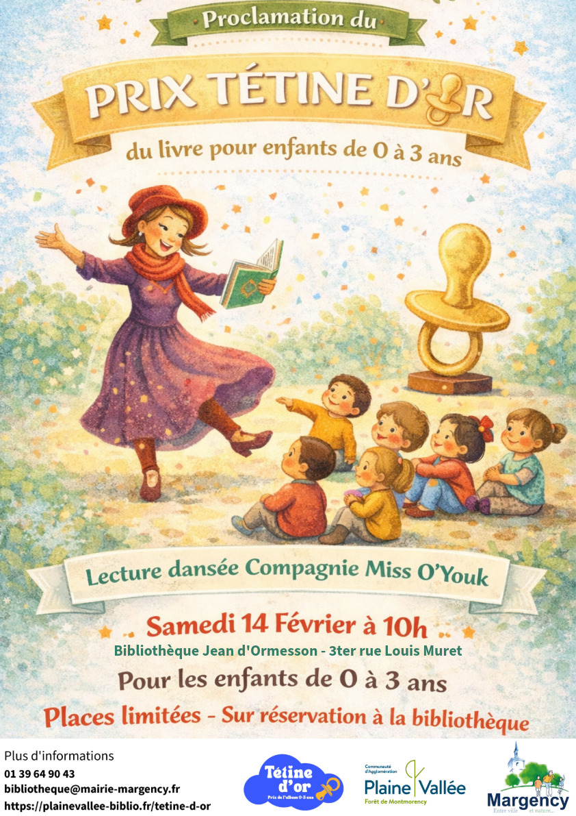 Lecture dansée - Prix Tétine d'Or Dans le cadre de la proclamation du Prix Tétine d’Or 2026, la ville de Margency propose une animation poétique et sensorielle dédiée aux tout-petits : une lecture dansée. Cette séance de conte, spécialement conçue pour les enfants de 0 à 3 ans, sera interprétée par une conteuse-danseuse de la Compagnie Miss O’Youk, mêlant mots, gestes et émotions pour éveiller l’imaginaire des plus jeunes. Samedi 14 février à 10h Animation pour les 0–3 ans à l’occasion du Prix Tétine d’Or 2026, qui récompense l’album le plus apprécié des tout-petits margencéens. Sur réservation uniquement Réservations directement à la bibliothèque Jean d’Ormesson, 01 39 64 90 43 ou bibliotheque@mairie-margency.fr Un moment tout en douceur à partager en famille, entre histoires et mouvements. |