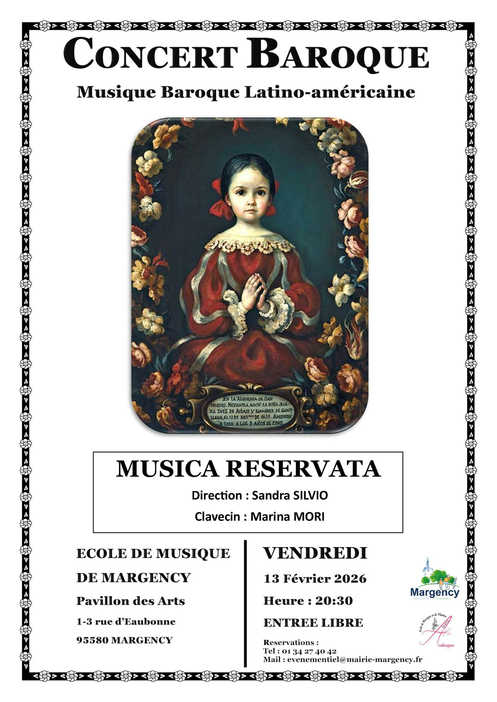 Concert Le prochain concert d'Arabesques approche à grands pas ! Nous avons le plaisir de vous convier à une soirée musicale exceptionnelle qui se tiendra le vendredi 13 février à 20h30, dans le cadre enchanteur du Pavillon des Arts. Depuis 1993, Musica Reservata s’est consacré à cultiver et à promouvoir la musique ancienne au Venezuela, avec un répertoire qui va du Moyen Âge jusqu’à l’époque baroque, avec un répertoire qui va du Chant Grégorien jusqu’à la Polyphonie de la Renaissance et qui a obtenu d’excellentes critiques nationales et internationales.Libre participation. Renseignements et réservations au 01 34 27 40 42 ou par mail à evenementiel@mairie-margency.fr |