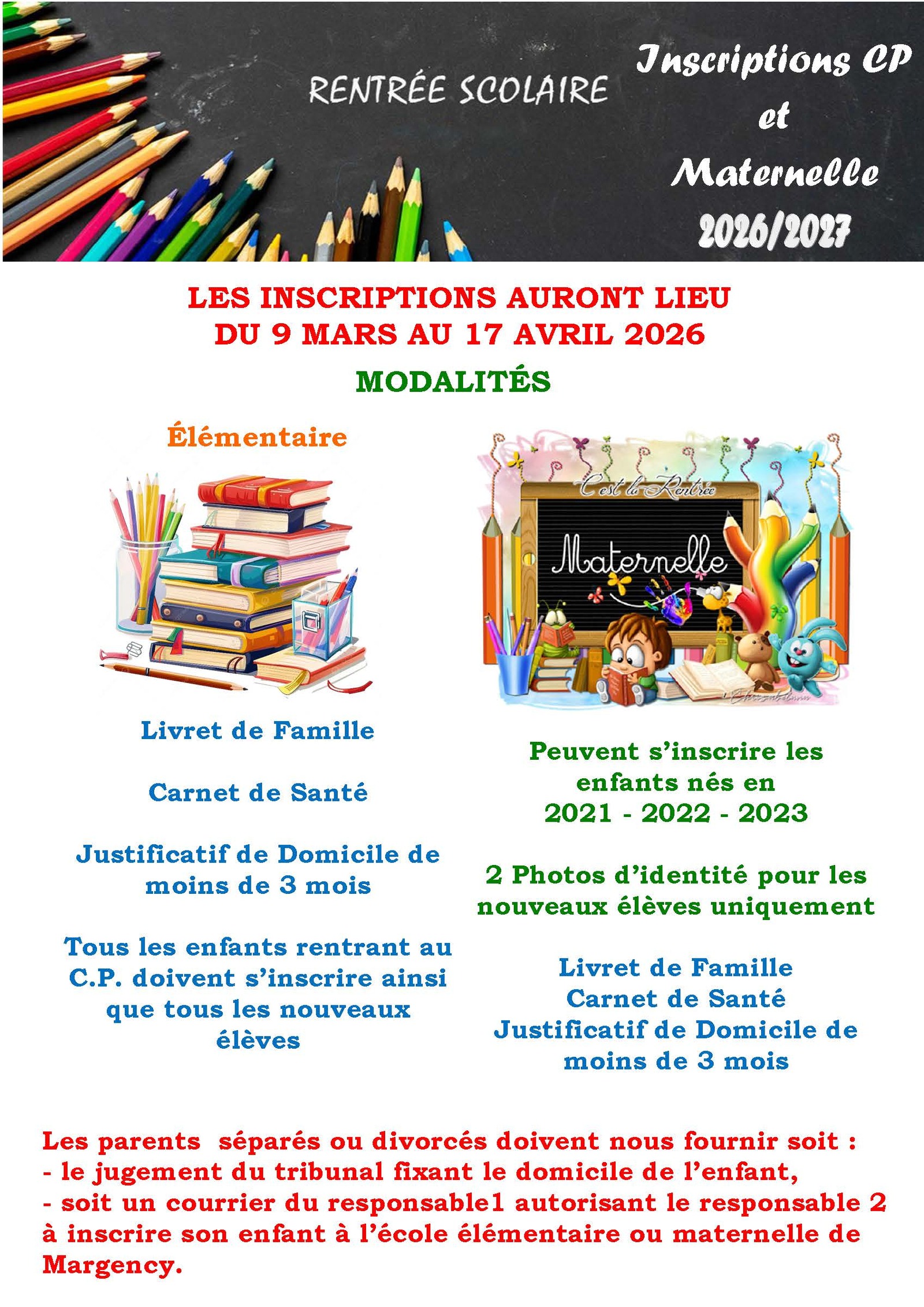 Rentrée scolaire 2026-2027 Inscriptions Chers parents, les inscriptions aux écoles maternelle et élémentaire pour la rentrée 2026/2027 auront lieu du 9 mars au 17 avril. Vous trouverez le dossier d'inscription directement sur le site de la ville, à remettre en mairie ou par e-mail à scolaire@mairie-margency.fr Pour plus informations, contactez la mairie au 01 34 27 40 76. |