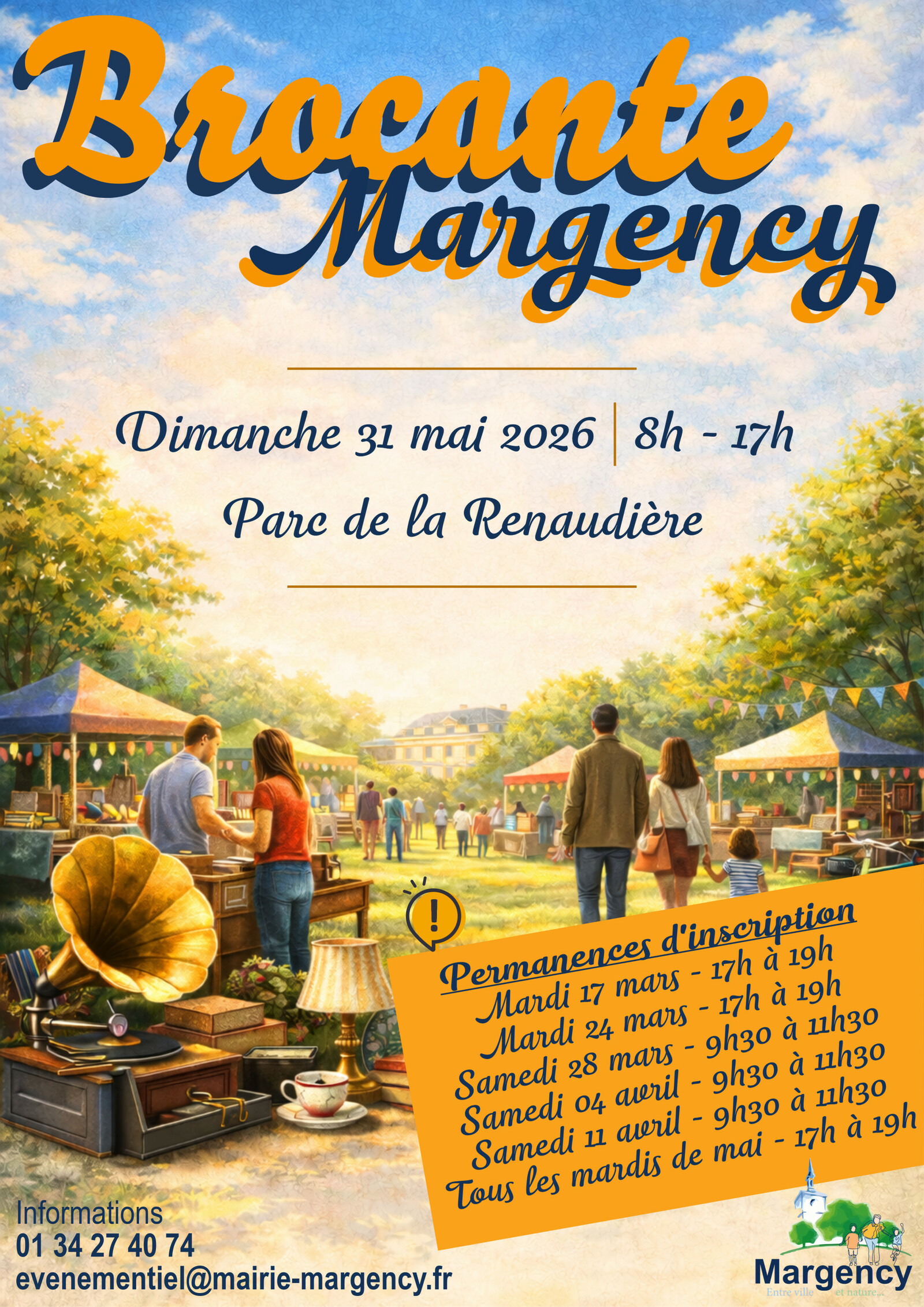 La brocante de Margency La commune de Margency vous invite à sa 2e édition de la brocante ! Venez flâner au cœur de notre magnifique parc et profitez d'une journée conviviale sous le signe de la découverte et du partage. Date : dimanche 31 mai 2026 Horaires : 8h00 - 17h00 Lieu : Parc de la Renaudière Entrée gratuite Une belle occasion de se retrouver en famille ou entre amis dans un cadre verdoyant et animé. Ne manquez pas cet événement incontournable de la vie locale ! Pour plus d'informations, contactez la mairie au 01 34 27 40 74 ou par mail à evenementiel@mairie-margency.fr