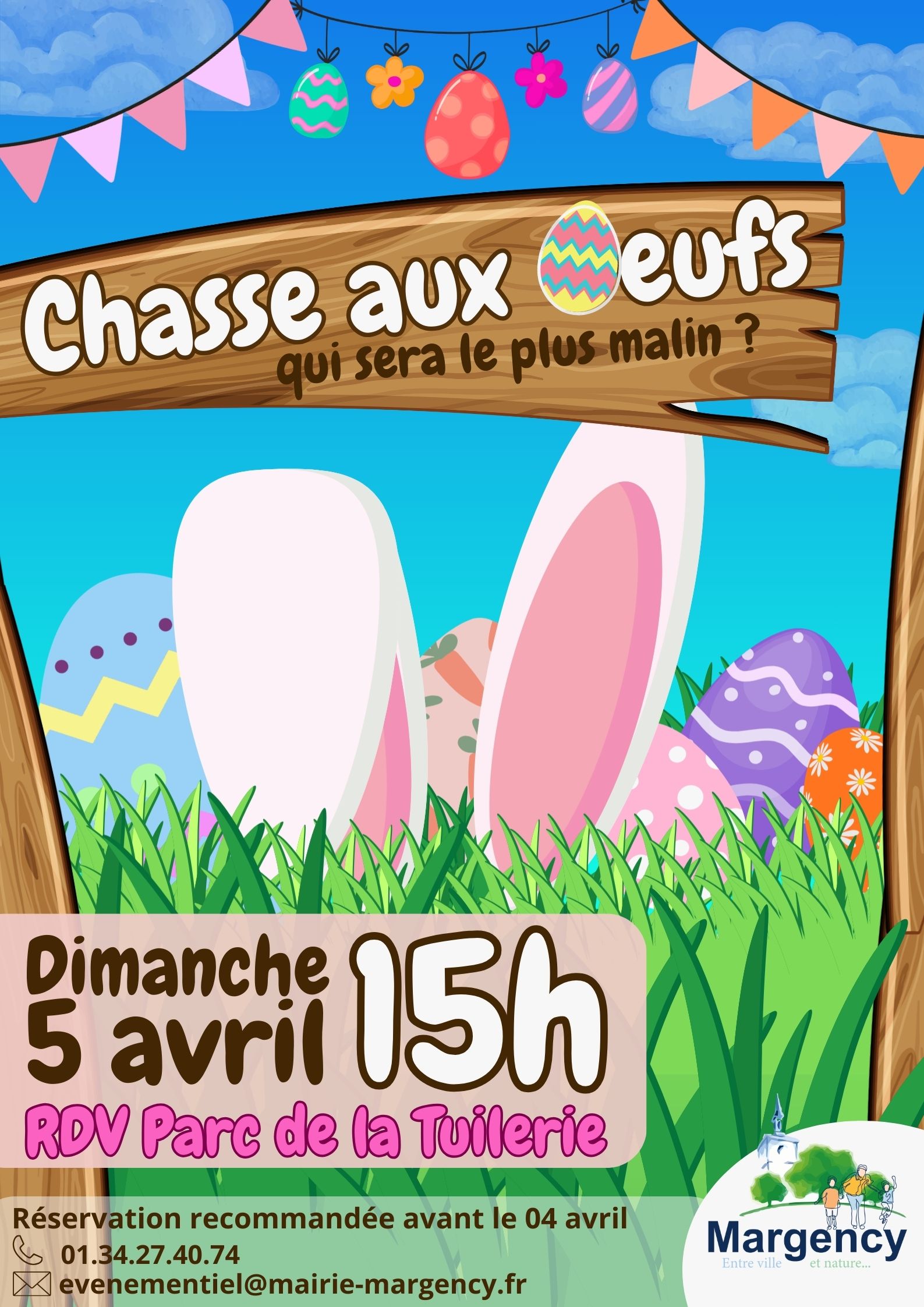 La chasse aux oeufs fait son grand retour à Margency ! Préparez vos paniers et venez partager un moment convivial en famille à l'occasion de la grande chasse aux oeufs de Pâques ! Partez à la recherche des délicieux oeufs en chocolat cachés dans le parc de la Tuilerie et profitez d'un après-midi festif et gourmand. Nous vous donnons rendez-vous le dimanche 5 avril à partir de 15h. N'attendez plus ! Inscrivez-vous dès maintenant au 01 34 27 40 74 ou par mail à evenementiel@mairie-margency.fr La ville de Margency vous met au défi de tous les retrouver ! Voyons qui sera le plus malin ! |