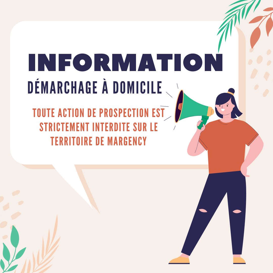 Démarchage interdit à Margency Information importante Nous vous rappelons que le démarchage est interdit sur la commune de Margency. Des personnes ont récemment été repérées en train de démarcher malgré cette interdiction. Si vous avez été confronté(e) à cette situation ou en avez été témoin, merci de contacter la police municipale. Pour effectuer du démarchage, une autorisation préalable est obligatoire. Il convient d’en faire la demande auprès du secrétariat de la mairie au moins 15 jours avant le début de la prospection. Restons vigilants ! |